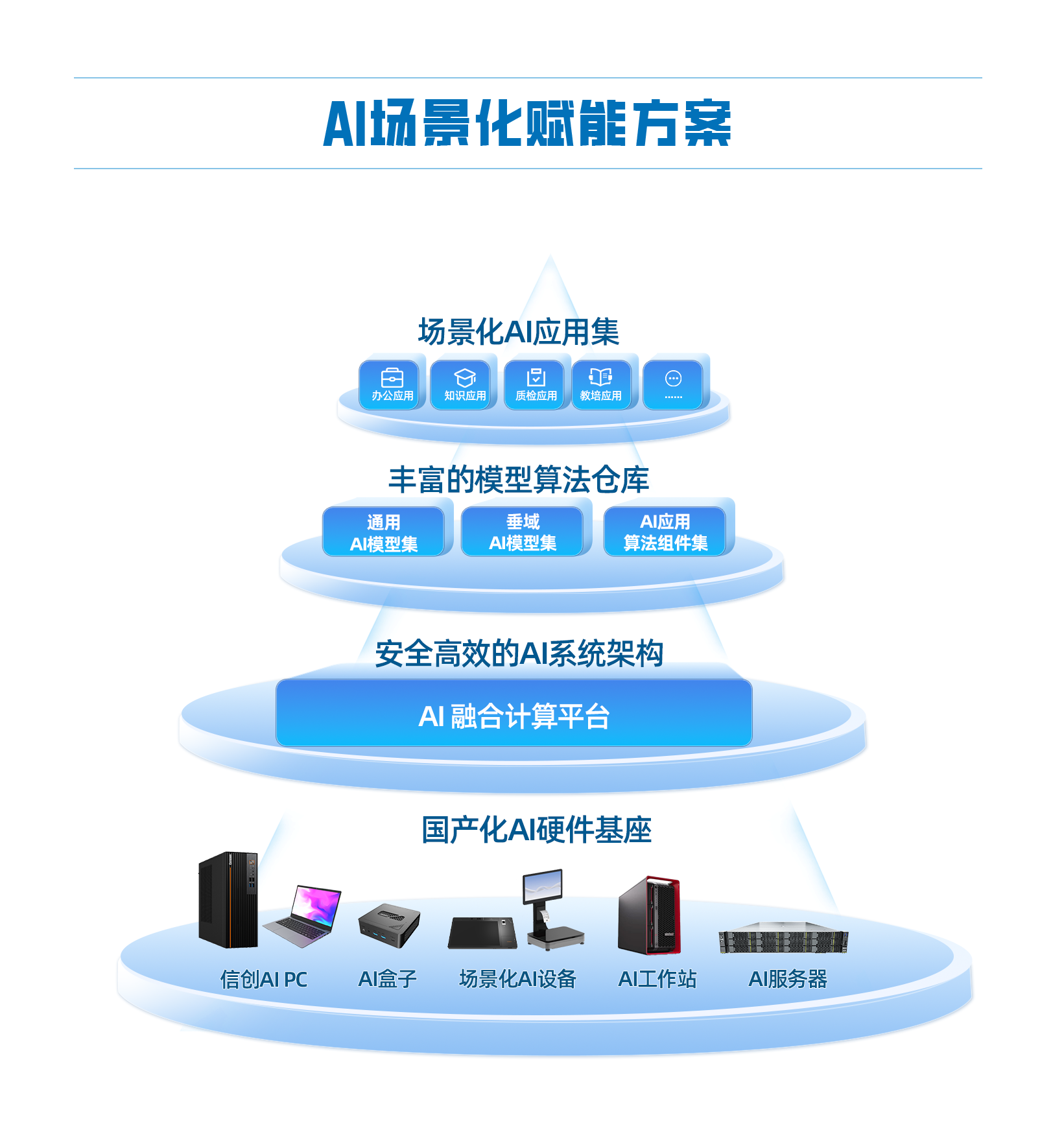 升腾资讯在AI领域持续深耕,重磅打造了“AI场景化赋能方案”,以覆盖算力中心、边缘工作站、行业终端在内的全系列国产化算力硬件为基座,以AI融合计算平台和AI模型仓库为能力之源,搭载丰富的行业AI应用解决方案,助力行业的经营者、工作者、参与者深化AI赋能,驱动业务价值突破。目前,升腾AI方案已在金融、政企、教育等行业场景成功落地,覆盖办公、专业知识应用、业务处理、物联网管理等多种应用领域。