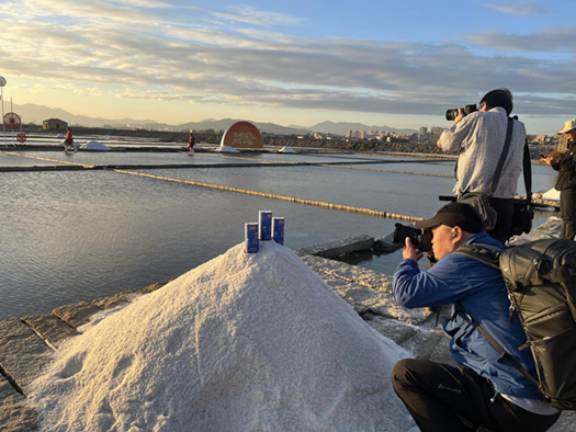 福盐集团生态海盐重要生产基地之一——山腰盐场,作为此次“山腰盐·闽台缘”生态福盐影像创作大赛打卡的第一站。初冬暖阳映照下的盐场,熠熠生辉,宛如一块巨大的颜料盘镶嵌于大地之上,在光影交错中织就出一幅幅绚丽画卷。摄影师们置身其间,或蹲下身子,或俯身趴在盐堆旁,各自寻找着最佳拍摄角度,试图将盐田的独特魅力定格在镜头中,如痴如醉。