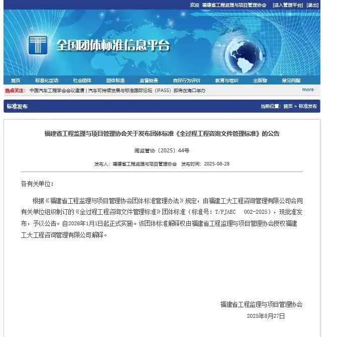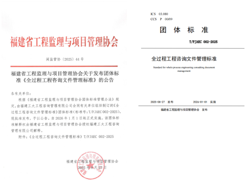 近日,福建省工程监理与项目管理协会发布团体标准《全过程工程咨询文件管理标准》(标准编号:T/FJAEC002-2025),自2026年1月1日起正式施行,为全过程工程咨询项目的文件管理提供统一、规范的操作指引。