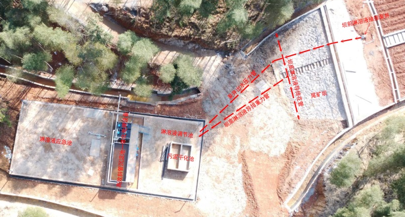 整治后尾矿库新建坝底淋溶液导排管,坝前淋溶液抽排泵井,淋溶液调节池,应急池,高效斜管沉淀池一体化设备,污泥干化池